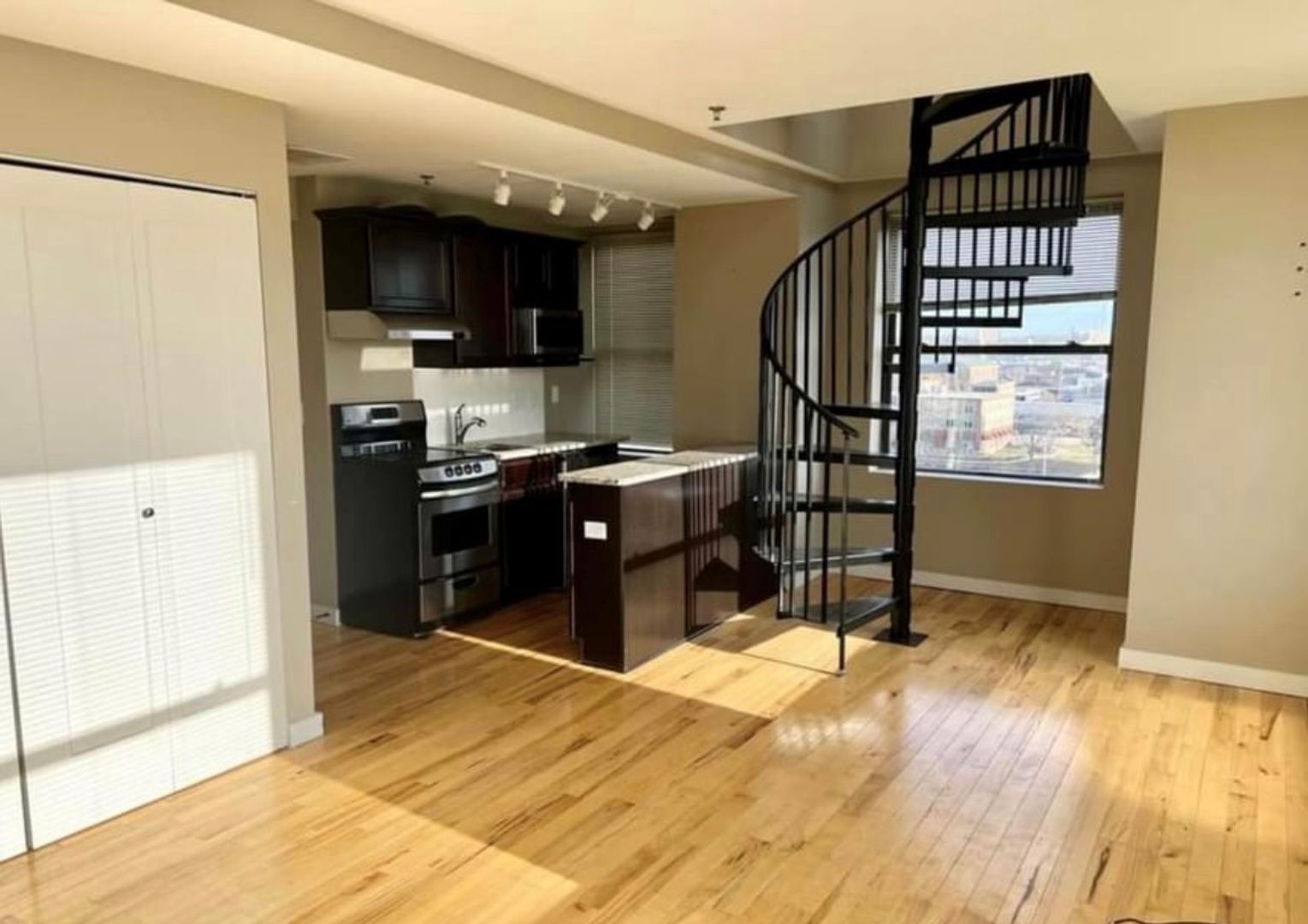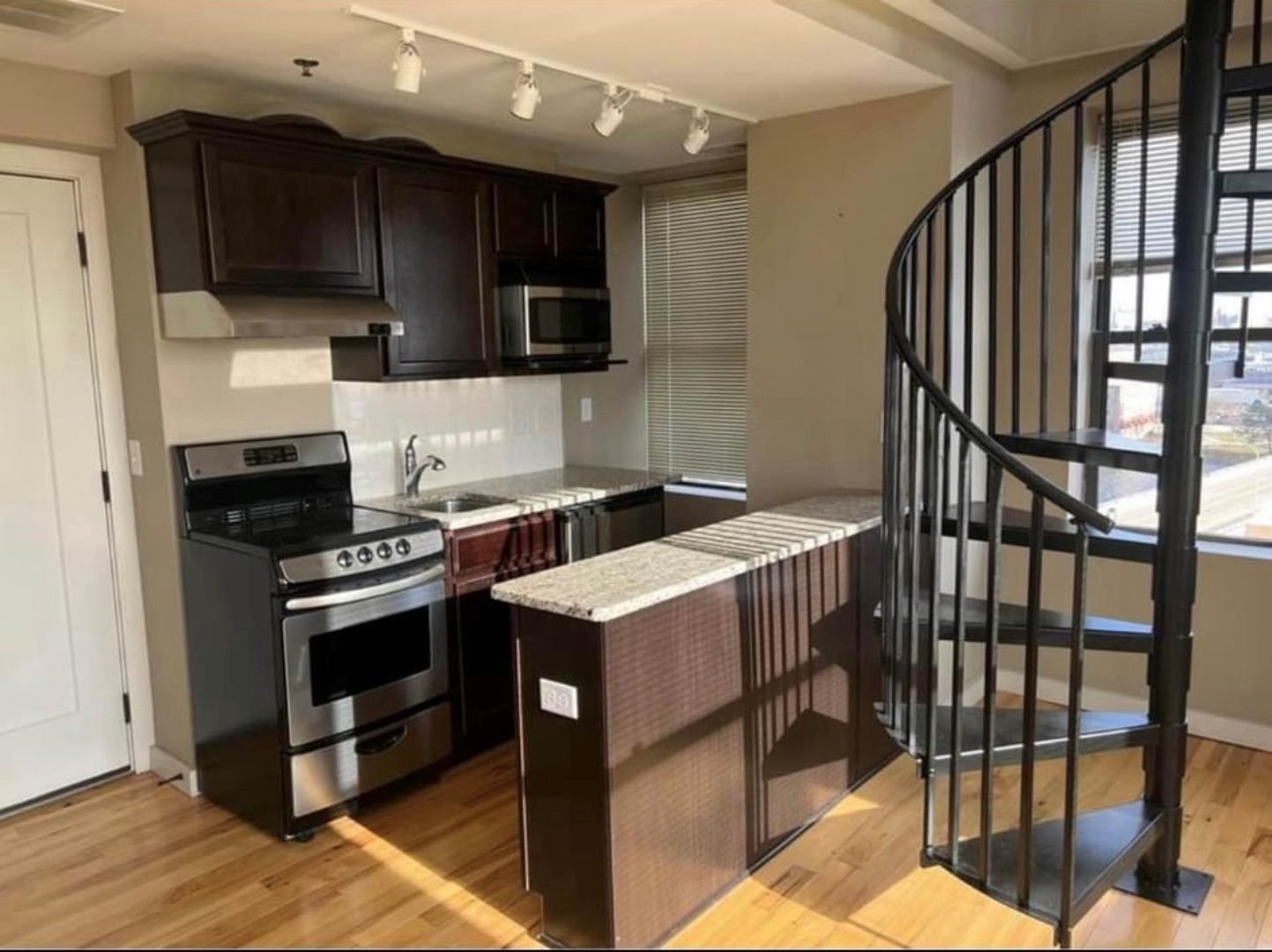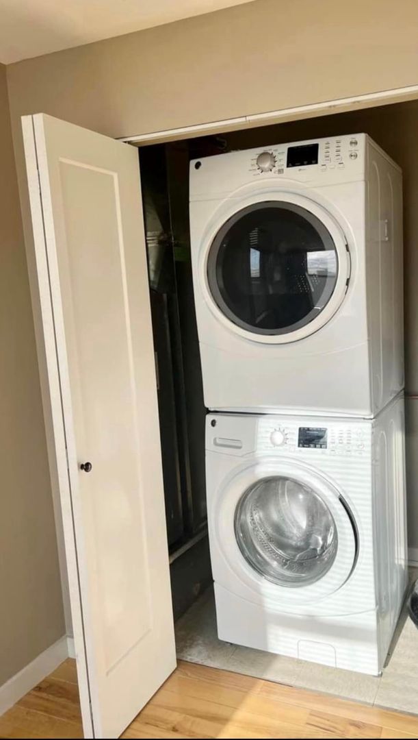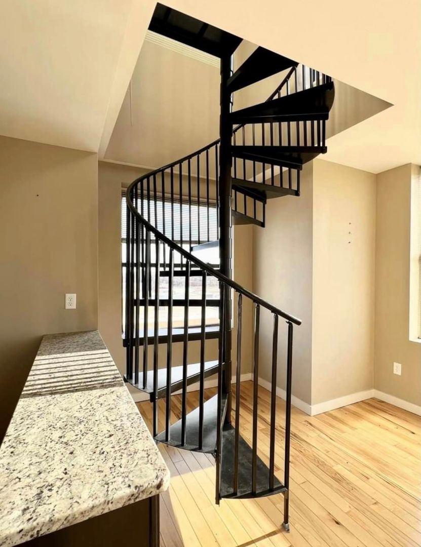 Goregous and unique split level 1 bedroom unit now available! Spiral staircase, hardwood and carpeted floors, walk in closet, and in unit laundry. Building features rooftop deck,